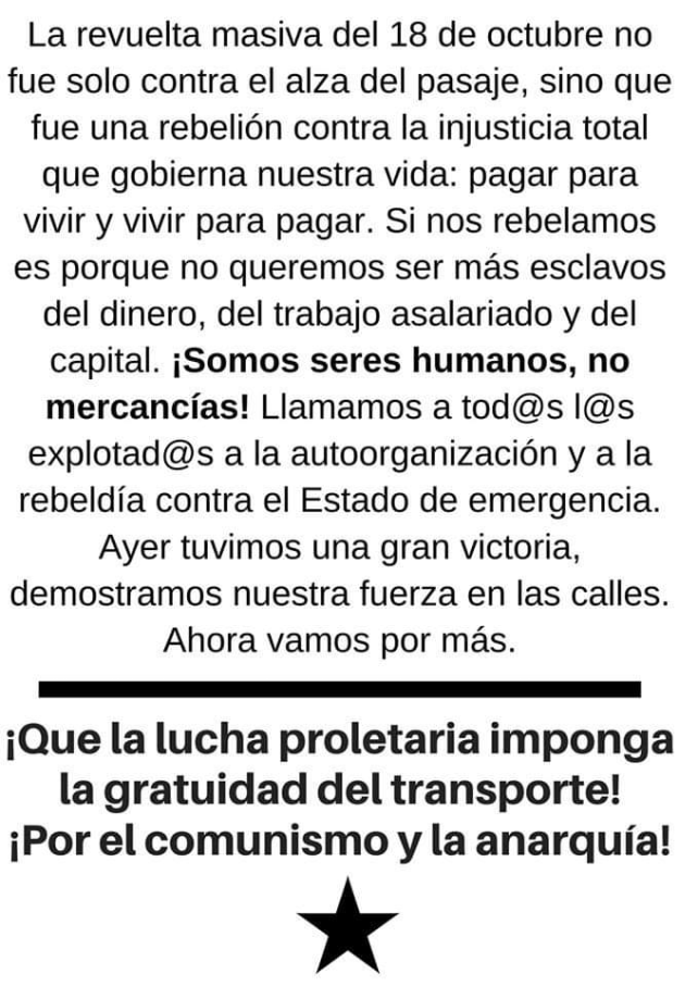 Die massive Revolte vom 18. Oktober war nicht nur gegen die Erhöhung der Transportpreise gerichtet, sondern es war eine Rebellion gegen die totale Ungerechtigkeit, die unsere Leben regiert: Bezahlen, um zu leben, und leben, um zu bezahlen. Wir rebellieren, weil wir nicht mehr Sklaven des Geldes, der Lohnarbeit und des Kapitals sein wollen. Wir sind menschliche Wesen, keine Waren! Wir rufen alle Ausgebeuteten zur Selbstorganisation und zur Rebellion gegen den Ausnahmezustand auf! Gestern war ein grosser Sieg, zeigen wir unsere Stärke auf den Strassen. Jetzt kommen wir für mehr.
